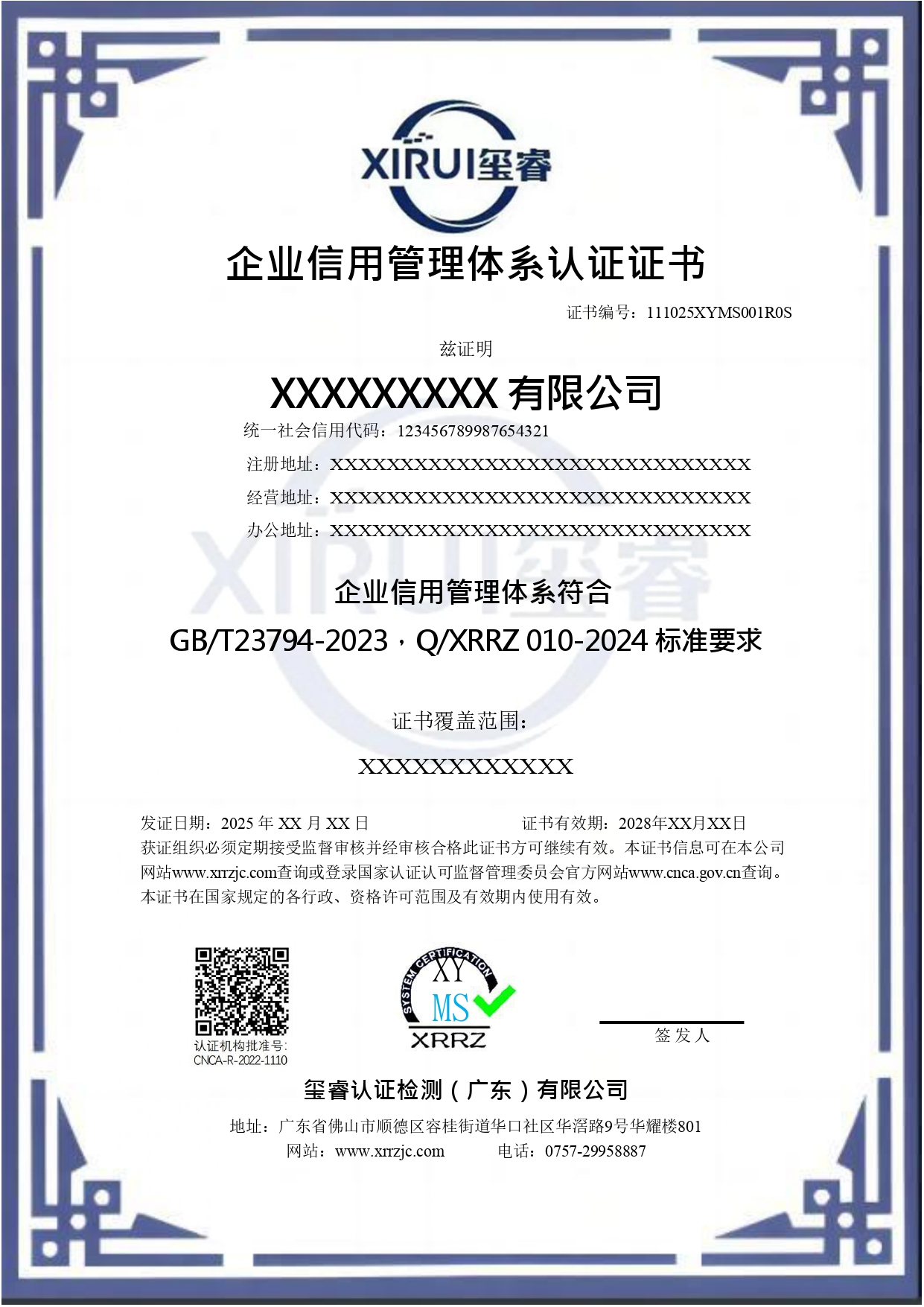 企业信用管理体系认证证书