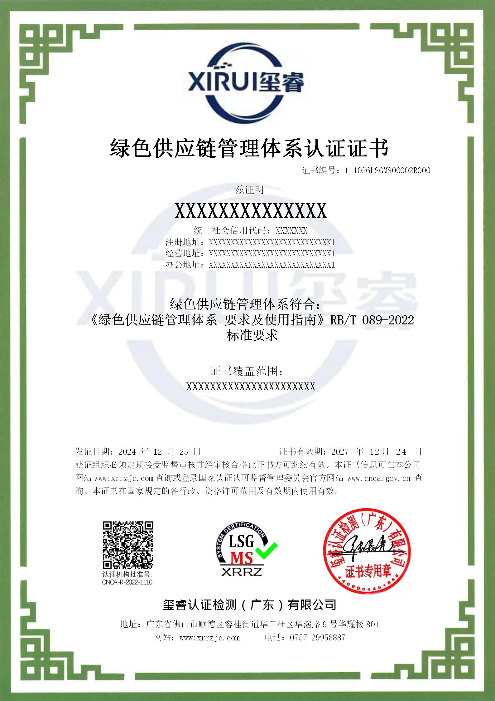 绿色供应链管理体系认证证书