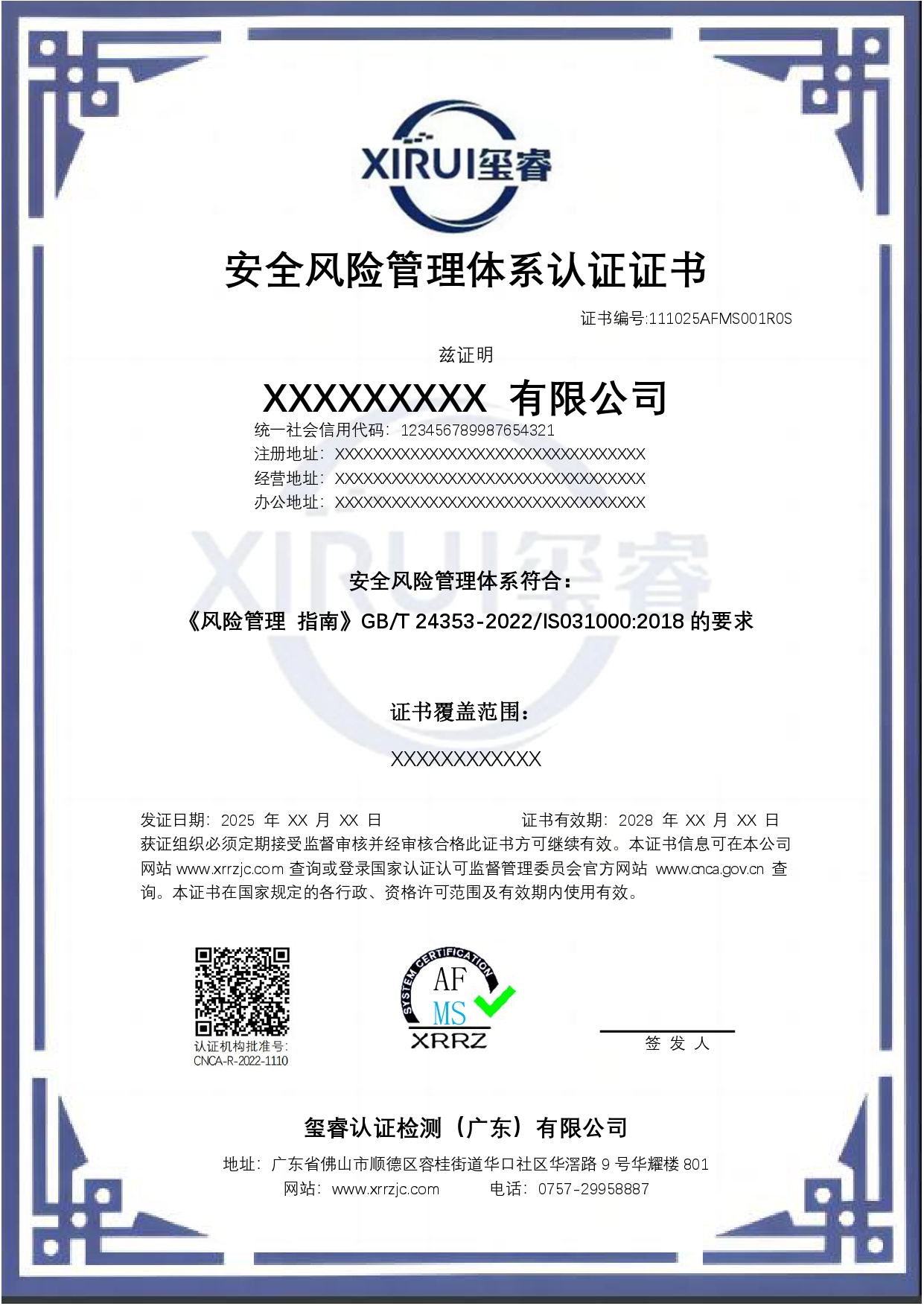 安全风险管理体系认证证书
